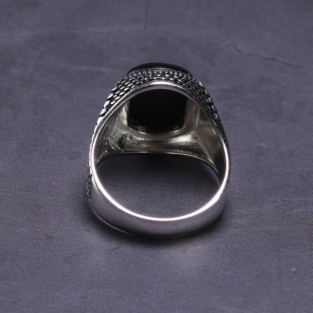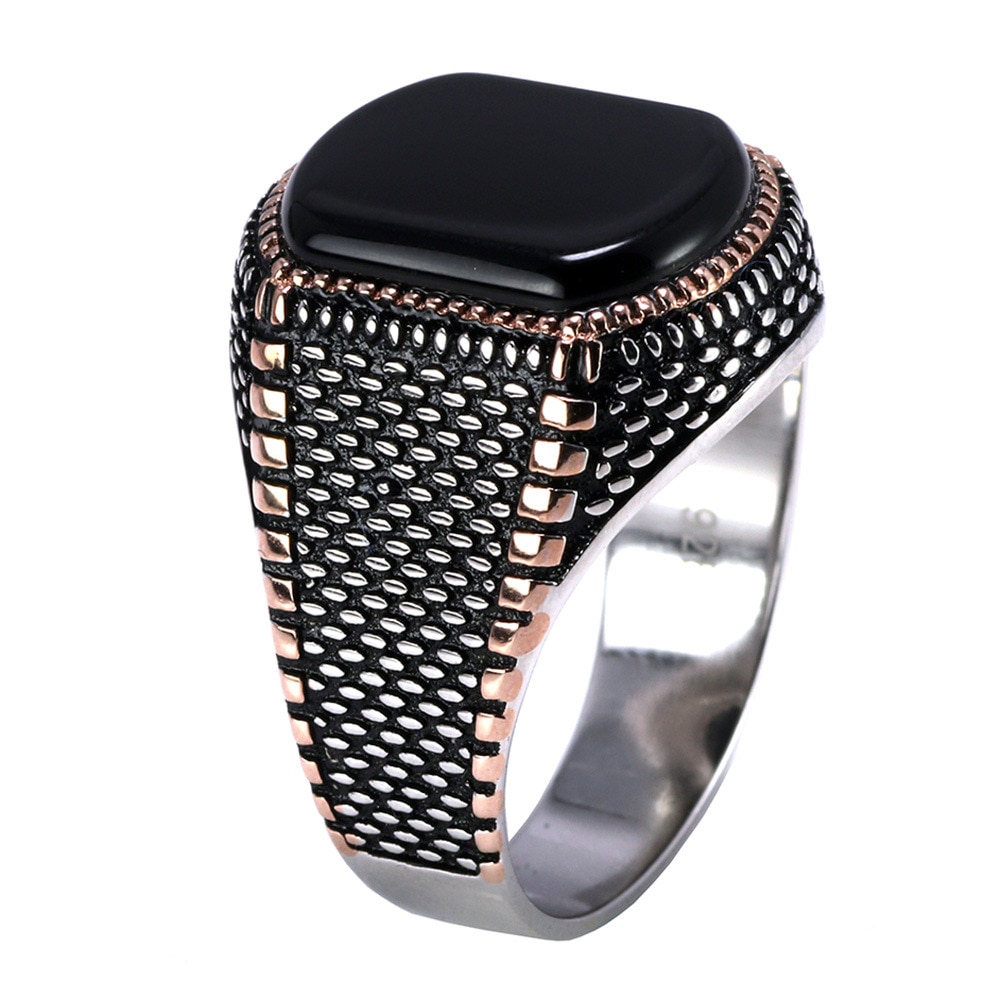 Superbe bague pour homme en argent 925 avec une pierre noir en onyx pour un style très masculin et très médiéval. La bague est disponible en 2 couleurs différentes: complètement en argent noirci ou en argent noirci avec les bordures rose.