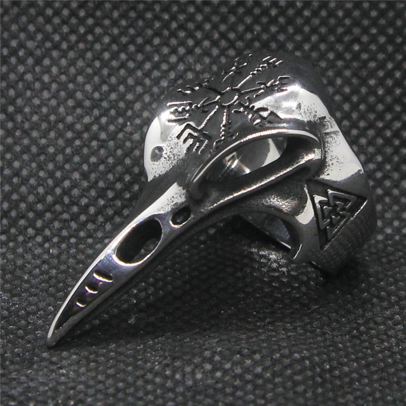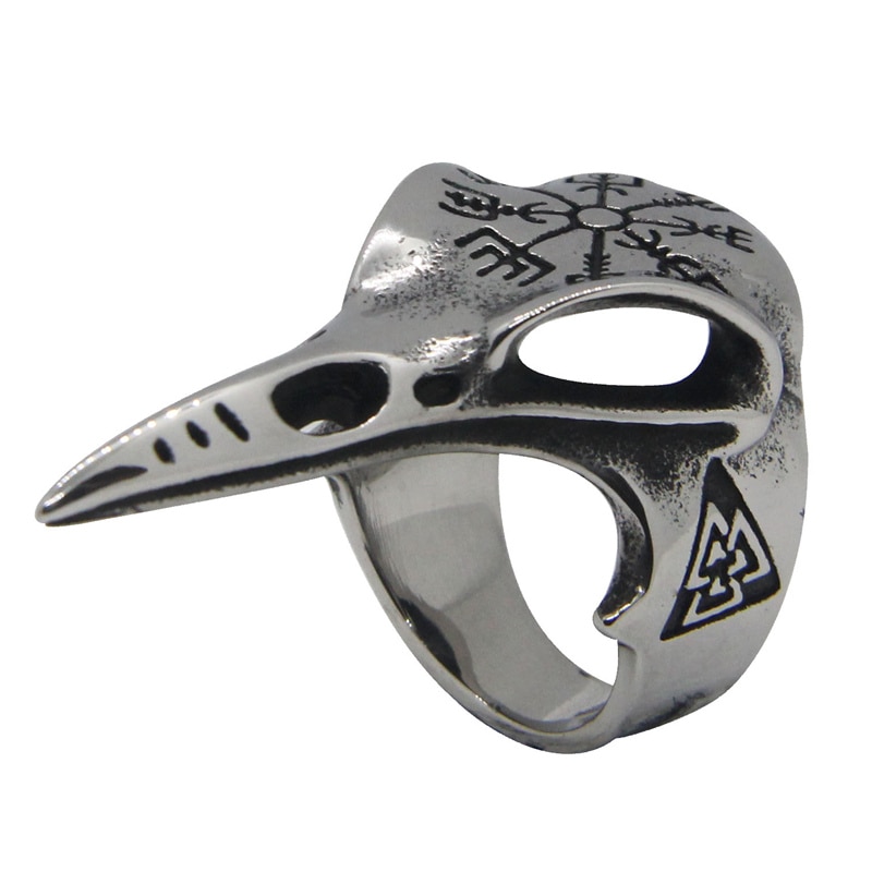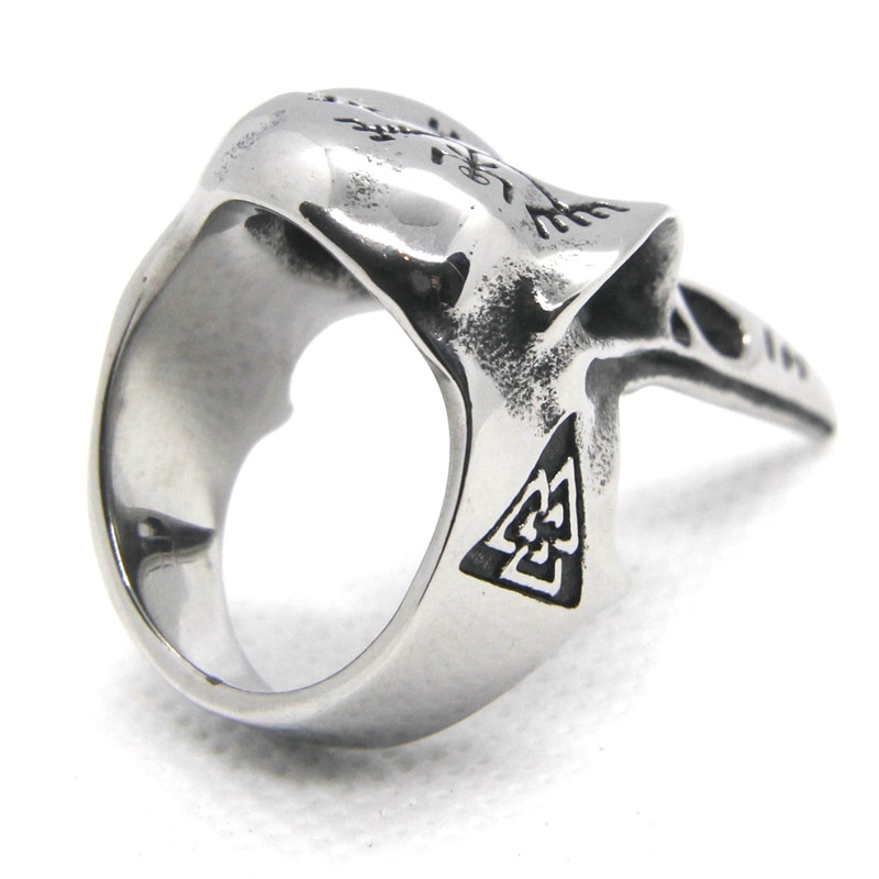Bague avec le crane d’un oiseau dans un style viking. Le crane qui y est représenté est celui du corbeau d’Odin, l’oiseau qui permet à son maître de voir le monde à travers ses yeux.