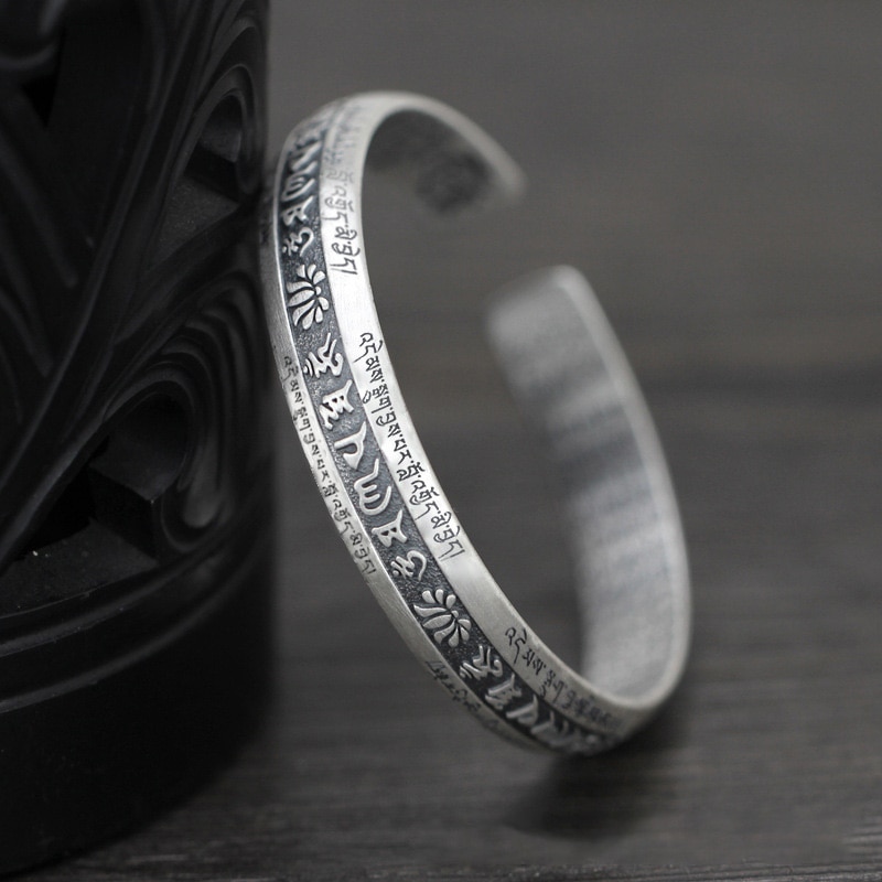 Magnifique bracelet Tibétain en argent pur et véritable 999 très rare à trouver. Ce bracelet est un bracelet de type jonc, lourd et masculin, il fait un total de 38g d’argent. Sur le bracelet on peut voir plusieurs fleurs de lotus ainsi que des mantras Tibétains pour un design vraiment élégant.