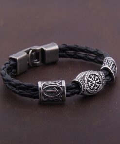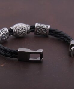 Il s’agit d’un véritable bracelet amulette nordique, avec en son centre le fameux végétvisir, ou roue nordique. De couleur noir et argent antique, c’est un bijou plutôt sobre et chic à porter en toute occasion, y compris lors de fêtes médiévales si vous êtes amateurs. Disponible en plusieurs tailles, vous pouvez choisir la longueur qui correspond le mieux à votre poignet.